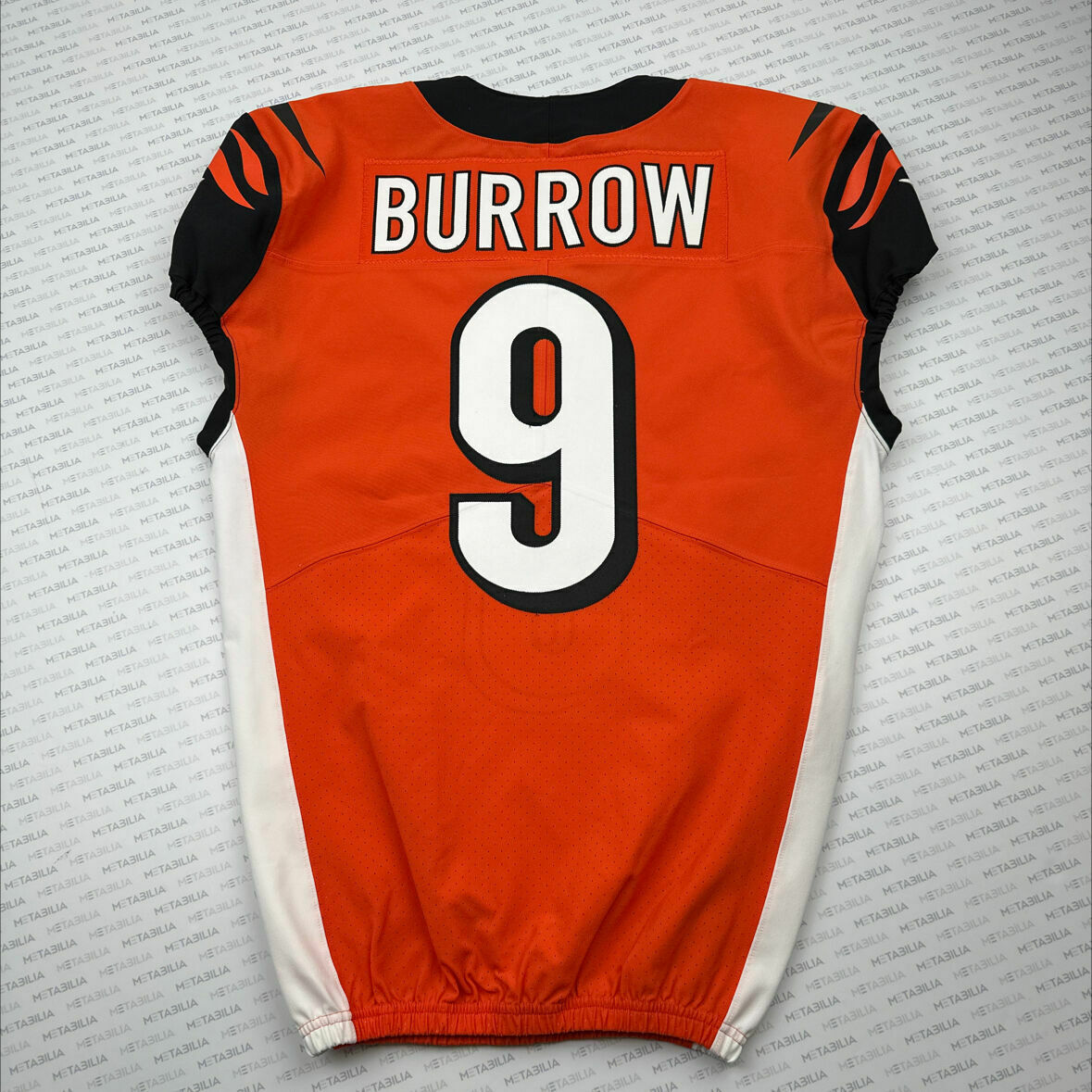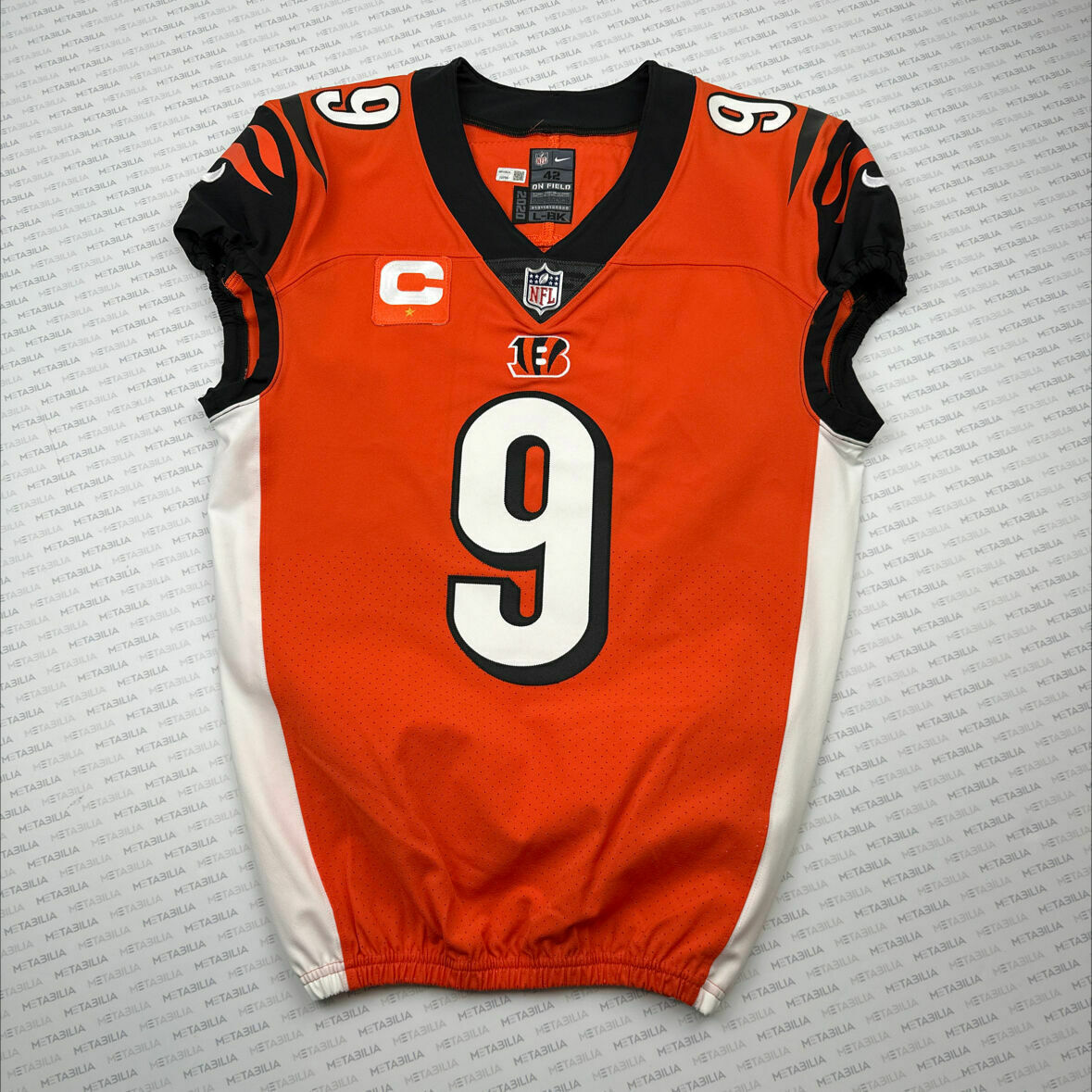 Enter to bid on a #9 Joe Burrow Orange Team Issued Jersey. This jersey includes a captains patch with one star. It is a size 42, the issued year is 2020, and the jersey version is L-BK. BURROW ORANGE TEAM-ISSUED JERSEYS ARE CURRENTLY IN LIMITED SUPPLY. Item is accompanied with a Certificate of Authenticity. Elect to take physical delivery of your item or resell it on Metabilia's Marketplace.