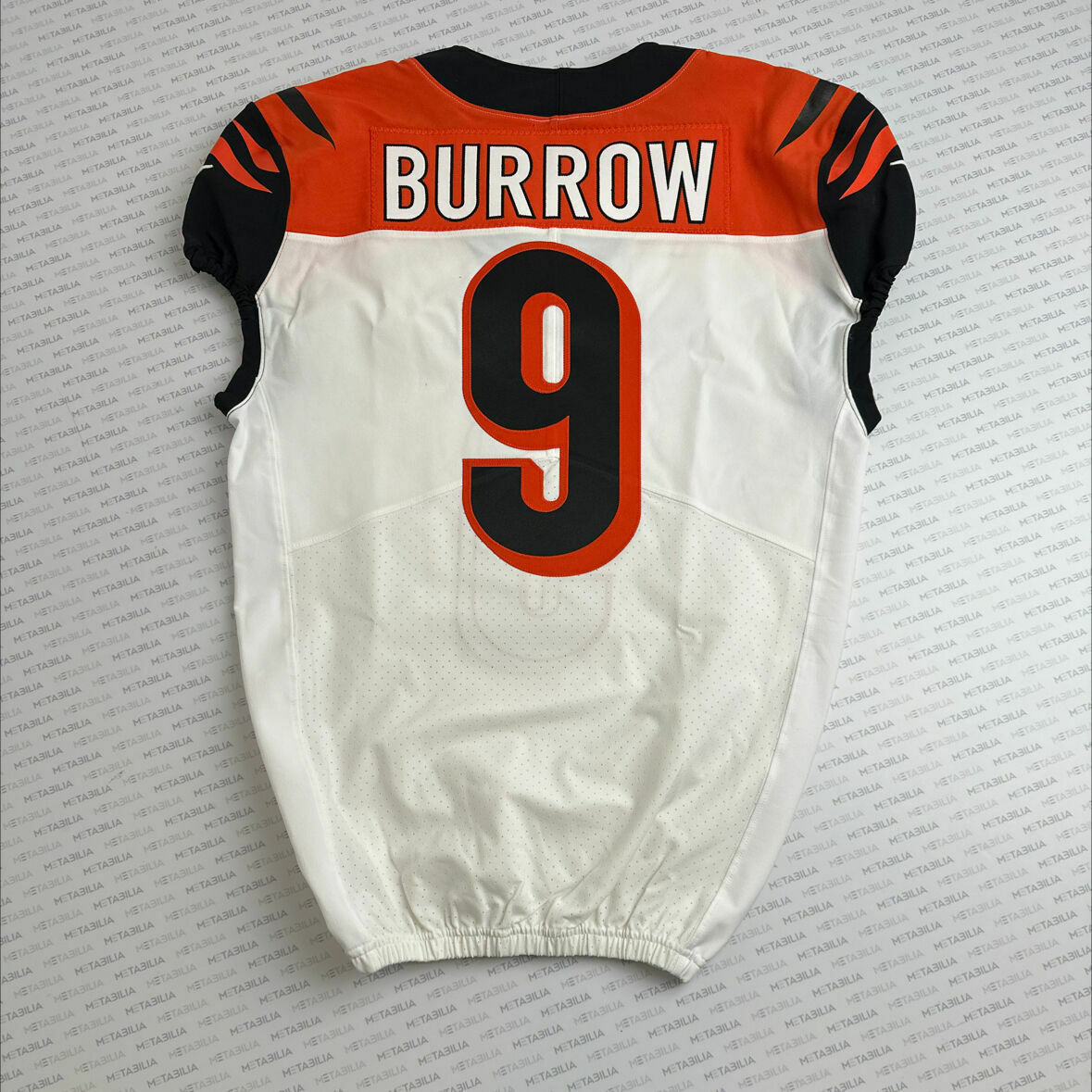 Enter to bid on a #9 Joe Burrow White Team Issued Jersey. This jersey includes a captains patch with one star. It is a size 42, the issued year is 2019, and the jersey version is L-BK. Item is accompanied with a Certificate of Authenticity. Elect to take physical delivery of your item or resell it on Metabilia's Marketplace.