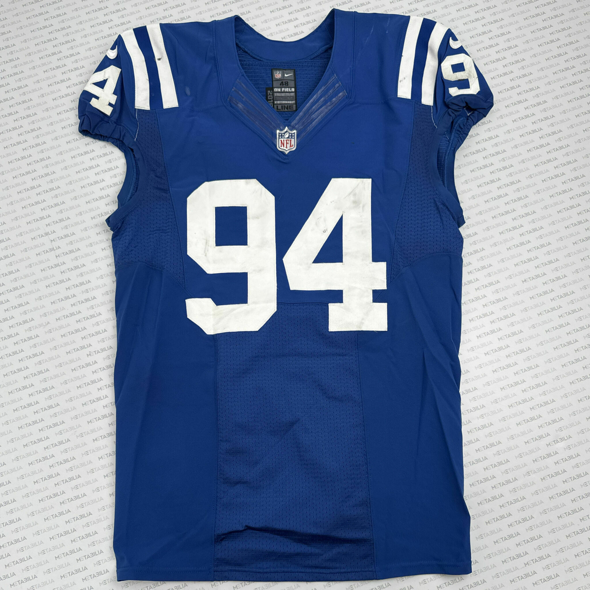 Enter to bid on a #94 Margus Hunt Indianapolis Colts Team-Issued Blue Jersey. Size 48, year 2016, and style LINE. Item is accompanied with a Certificate of Authenticity. Elect to take physical delivery of your item or resell it on Metabilia's Marketplace. *NOTE: Jersey may show light signs of wear/have light marks but will remain authenticated as Game-issued.*