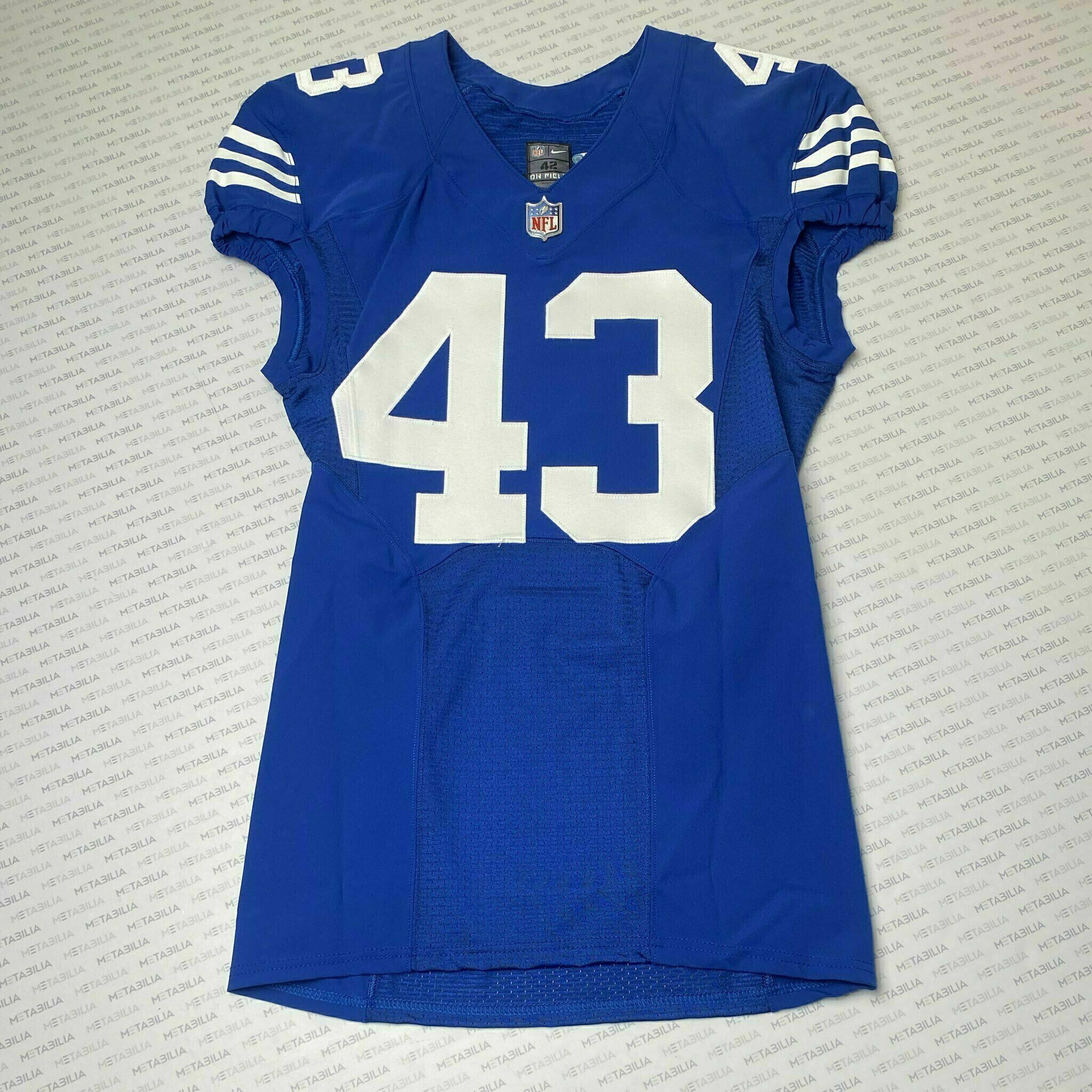 Enter to bid on a #43 Trevor Denbow Indianapolis Colts Team-Issued Blue Jersey. Size 42, year 2021, L-BK. Item is accompanied with a Certificate of Authenticity. Elect to take physical delivery of your item or resell it on Metabilia's Marketplace.