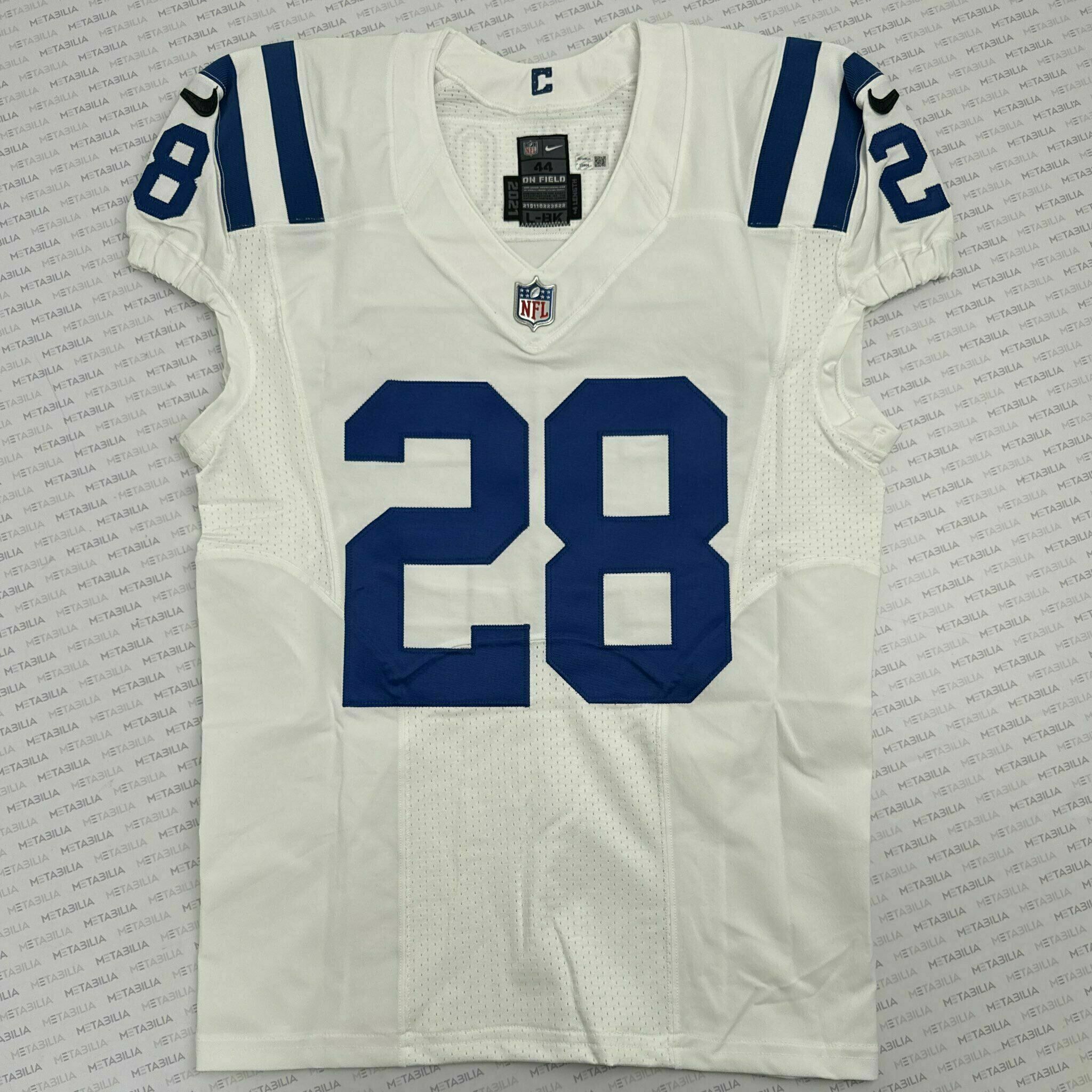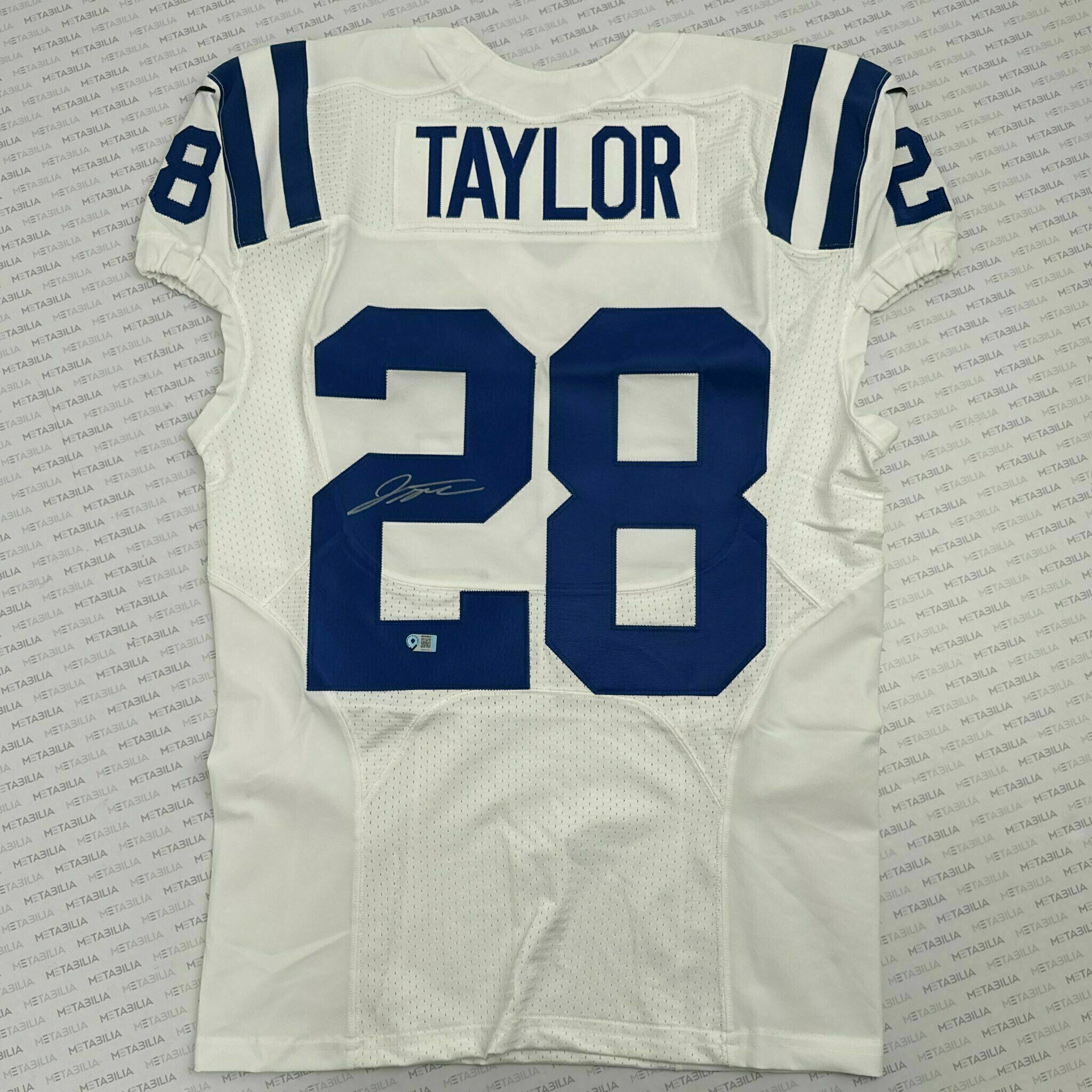 Enter to bid on a #28 Jonathan Taylor Signed Indianapolis Colts Team-Issued White Jersey. Size 44, year 2021, and style L-BK. Item is accompanied with a Certificate of Authenticity. Elect to take physical delivery of your item or resell it on Metabilia's Marketplace. *NOTE: Jerseys may show light signs of wear/have light marks but will remain authenticated as team-issued.* FEW IN CURRENT STOCK!
